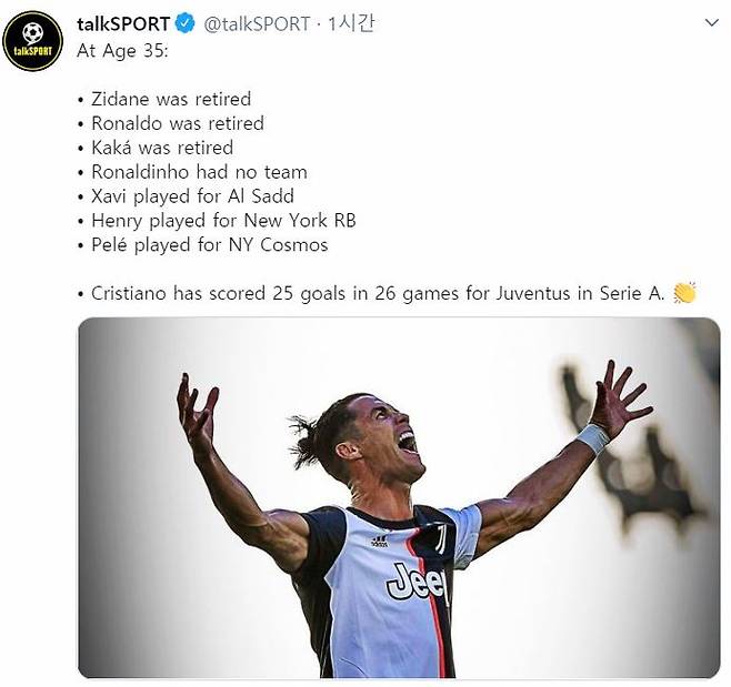 특히 영국 `토크스포츠`는 7일 "호날두는 35세의 나이에 세리에A 26경기에서 25골을 터뜨렸다. 이 나이에 지단과 호나우두, 카카는 은퇴했고 호나우지뉴는 소속팀을 구하지 못하고 있었다"고 언급했다.
