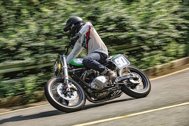 와인딩에서 스포츠 바이크를 타듯 행 오프를 하거나 오프로드 머신처럼 린 아웃 자세를 취해도 어색하지 않다. 남들이 보기에는 공격적으로 보이지만 그려지는 라인 자체가 느긋하여 정작 자신은 여유롭다. 1단 출발 중 클러치를 살짝 튕겨주면 프런트를 들어 올린다. 낮게 무게중심이 깔린 차체때문에 일정 각도까지 올라와야 윌리를 유지할 수 있는데 기대보다 엔진의 토크가 충분했다. 우려했던 던롭 K 180 타이어는 도로주행에 상상 이상의 성능을 보여주며 만족시켰다.