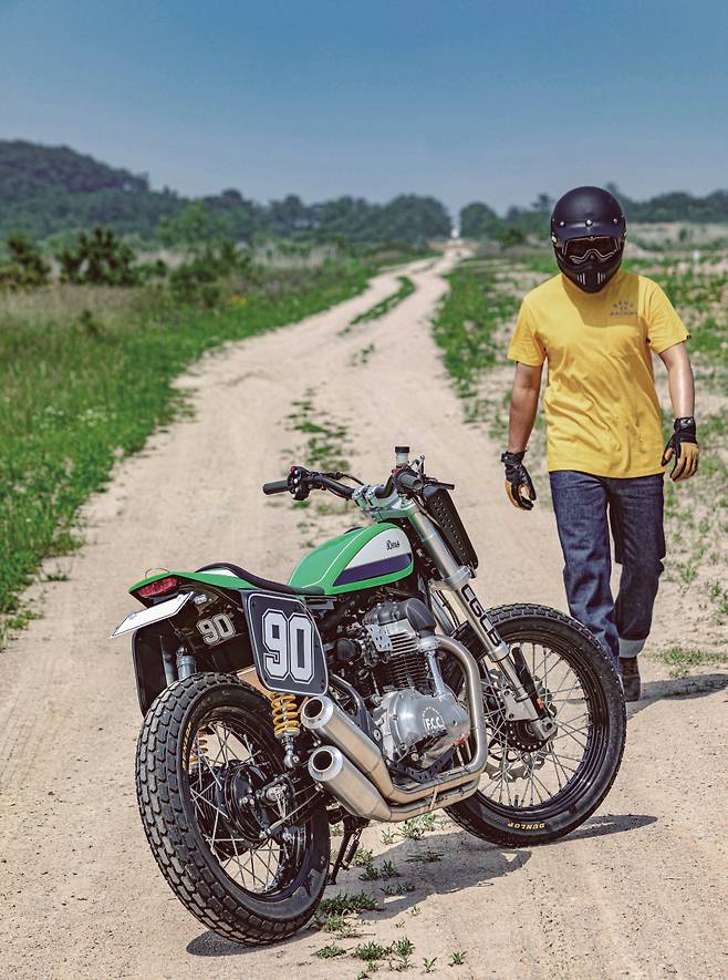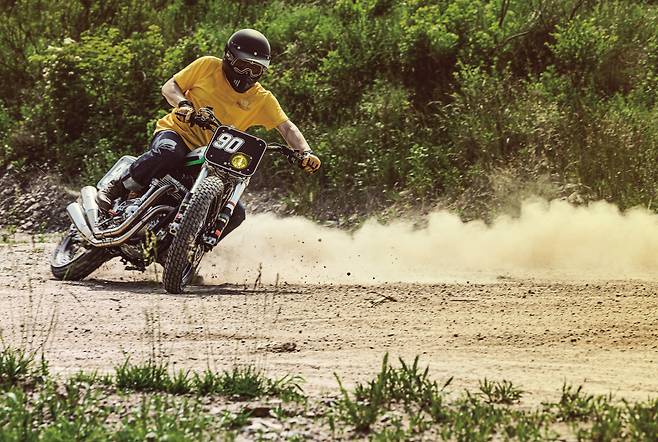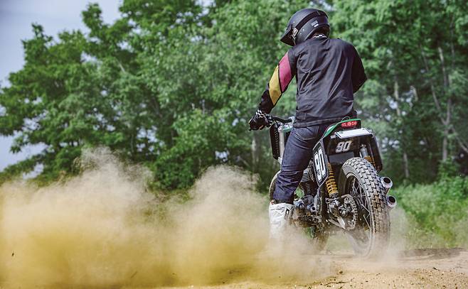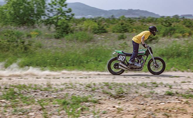 테스트는 흙바닥에서도 이루어졌다. 이 세상에 한 대밖에 없는 바이크를, 그것도 막 커스텀이 끝나서 반짝반짝한 새 바이크를 흙 위에서 미끄러트리며 타는 것은 꽤나 심장 떨리는 일이다. 그래도 이 머신의 정체성을 제대로 느껴 보려면 흙 위를 달려봐야지 않겠나. 포장도로 위에서도 박력 넘치던 머신을 흙바닥에 올려놓으니 정말 강력하다. 스로틀을 여는 대로 흙을 한움큼씩 뒤로 뱉어낸다.