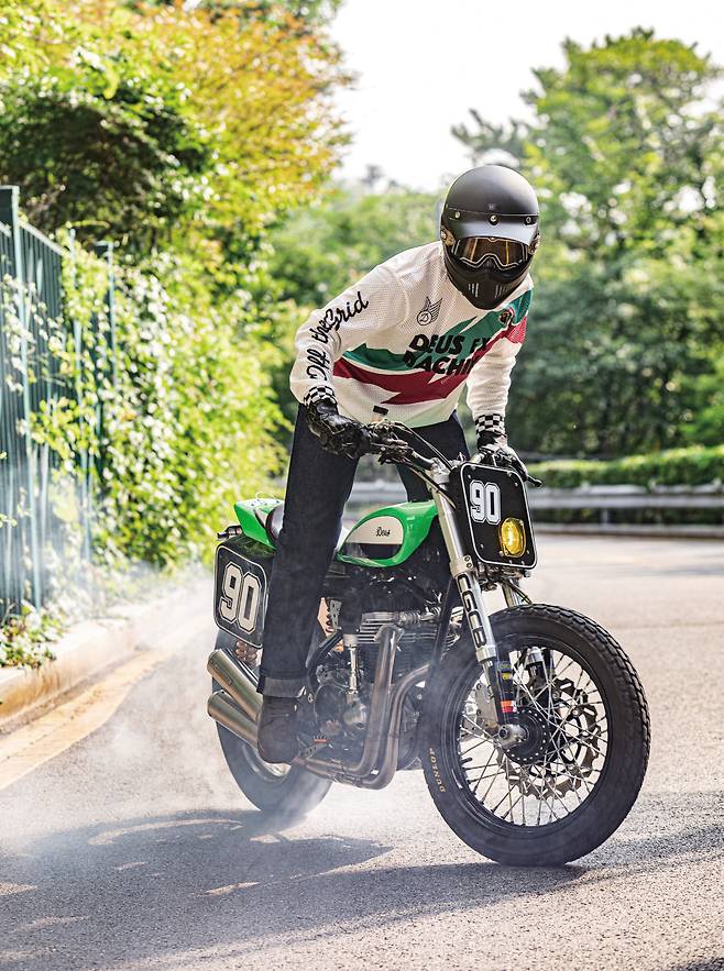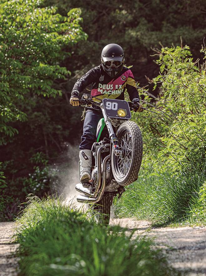 Wbarrels의 커스텀을 담당한 크레이지 개러지는 국내 커스텀 빌더 중에서도 스타일리시하면서도 뛰어난 주행 성능까지 발휘하는 것으로 유명하다. 이번에 제작된 데우스 커스텀 바이크는 가와사키 W800의 차체 지오메트리를 재설정하여 더트 트랙에 초점을 맞췄고, 불필요한 부분은 제거하여 경량화를 실현했다. 그래서 W800이 가진 이미지와 성능은 머릿속에서 완전히 지우고 타야 했다. 카랑카랑한 엔진 필링과 눈길을 사로잡는 스타일의 바이크로 완전히 변신했으니까.