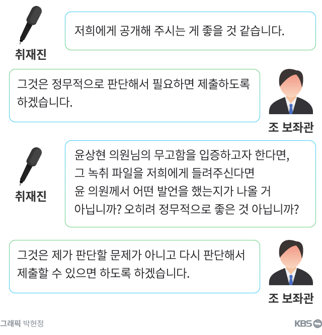 피의자로 입건된 조 보좌관은 지난달 KBS와의 인터뷰에서 이 파일을 자신이 갖고 있다는 취지로 말한 바 있다. 윤상현 의원의 결백을 주장하고 싶다면 문제의 파일을 공개하는 게 어떻겠느냐는 취재진 요청에 그는 "정무적 판단을 해보겠다"고 답했다. 아래는 취재진과 윤 의원 보좌관 조 모 씨 사이 오간 인터뷰 대화다.