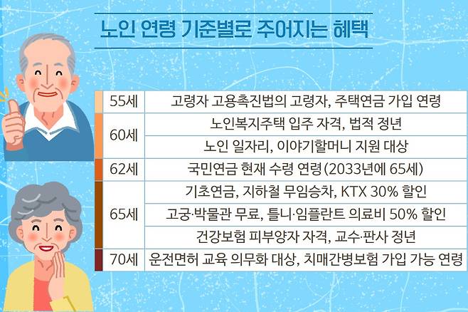 대체로 65세를 노인 기준으로 정하고 있지만 복지 정책마다 적용 연령에 차이가 있다. 사기업·공기업에서 정년은 법정 정년을 규정한 고용상 연령차별금지법에 따라 60세다. 노인일자리, 이야기할머니 등 사업에 참여할 수 있는 나이도 60세다. 반면 노후연금인 국민연금은 62세부터 지급된다. 이 밖에 저소득 노인에게 별도로 주는 기초연금의 지급 개시 연령은 65세다. 지하철 무임승차, KTX 30% 할인, 박물관 무료입장 등도 일제히 65세부터 가능하다.