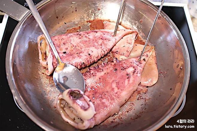→ 냉동 오징어는 냉장 해동 후 흐물거림 없도록 칼집을 이쁘게 낸다.