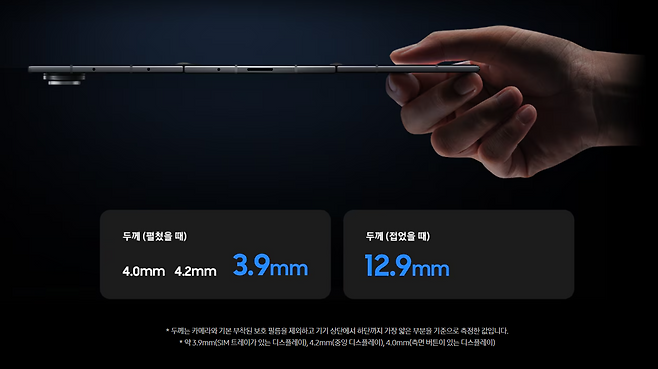 갤럭시 Z 트라이폴드는 중앙과 오른쪽, 두 지점을 접는 인폴딩 구조를 적용했습니다. 펼치면 10인치 화면이 되고, 접으면 6.5인치 스마트폰 형태로 바뀌는 구조입니다. 두께도 펼쳤을 때 3.9mm, 접었을 때 12.9mm로 역대 갤럭시 Z 시리즈 중 가장 얇은 편이라고 합니다. 삼성은 힌지와 하우징을 통째로 다시 설계하며 힘을 세 방향으로 분산되도록 만들었고, 디스플레이 분해, 결합 방식도 개선했다고 설명했습니다.