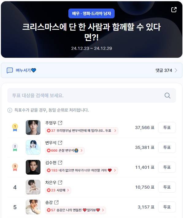 12월 23일부터 시작되어 12월 29일까지 진행된 인기투표에서는 변우석, 김수현을 제치고 37,566표로 압도적인 1위를 기록하며 팬들의 뜨거운 사랑을 받은 바 있습니다.