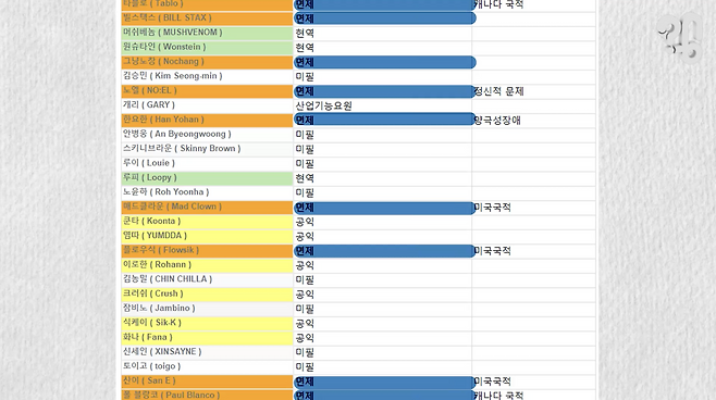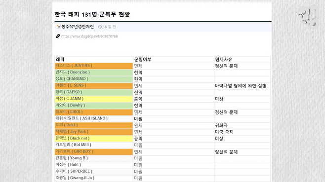 이 사진을 보라. 국내 래퍼 131명의 군 복무 현황을 정리한 표인데, 한눈에 봐도 군 면제자 비율이 꽤나 높아 보여서, 래퍼 송민호의 부실복무가 논란인 요즘, 커뮤니티에서 다시 핫해졌다.