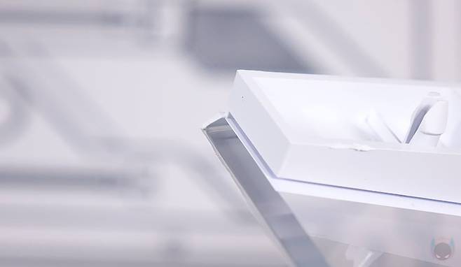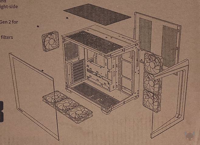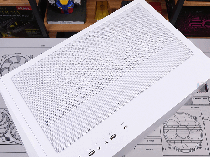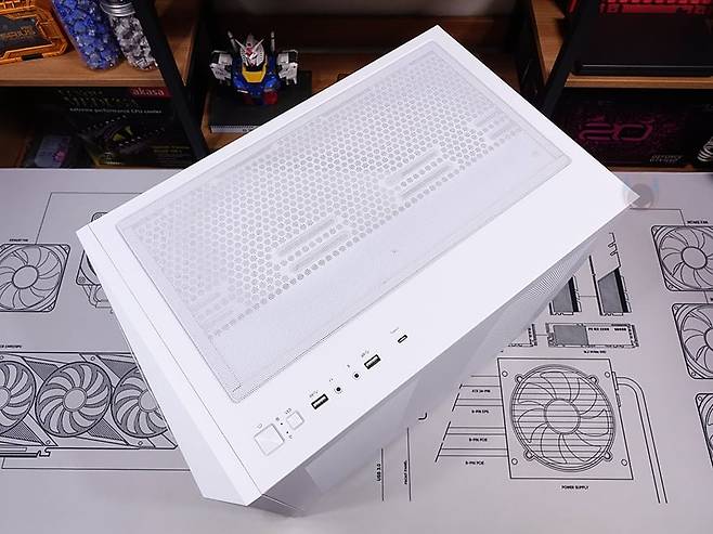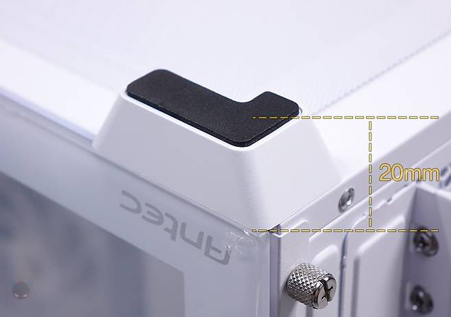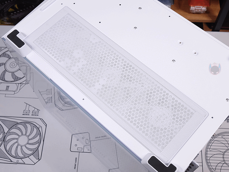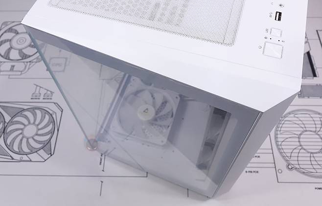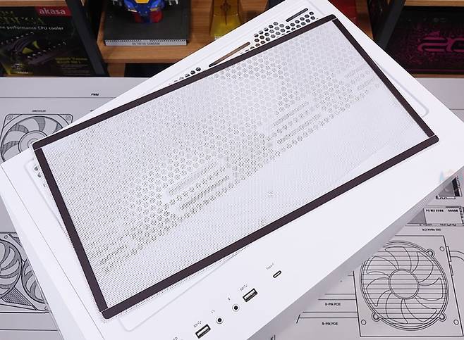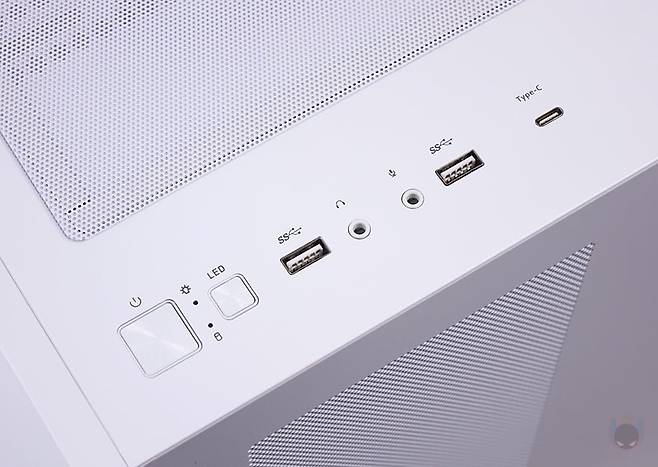 케이스 상단에는 맨 오른쪽 앞부분에 버튼 및 포트가 배치되어 있는데, 전원버튼, LED 버튼, USB 3.0, 오디오, 마이크, USB 3.0, USB 3.2 Gen2 Type-C 포트순으로 적용되어 있습니다. 그리고, 자석방식의 먼지 필터도 적용되어 있으며, 필터를 분리하면 상단 쿨링효과로 벌집 모양의 에어홀 처리와 함께 추가 쿨링시스템을 갖출 수 있게 나사홀도 적용되어 있죠. 팬을 장착했을 때는 140mm 경우 최대 2개, 120mm 경우 최대 3개를 장착할 수 있고, 수랭쿨러 사용 시 최대 360mm 라디에이터를 장착할 수 있습니다.