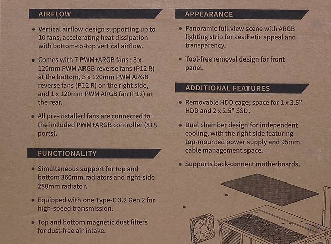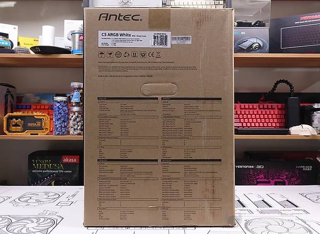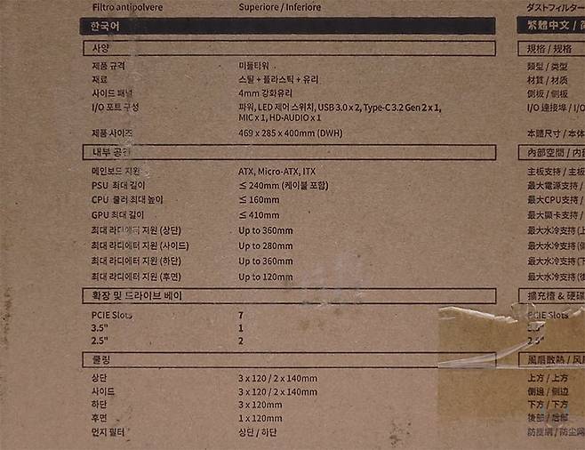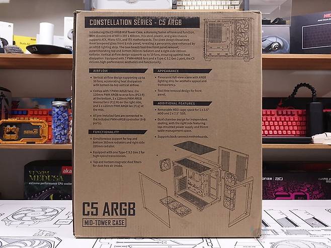 제품박스부터 살펴보면, 먼저 나왔던, C8, C3 ARGB와 마찬가지로 C5 ARGB 역시 전면에는 제품 이미지와 모델명을, 후면에는 C5 ARGB의 주요 특징을 표기해 놨으며, 양쪽 측면에는 한국어를 포함해 각 나라별 언어로 기본 사양을 표기해 놨습니다. 주요 특징 소개에는 최대 팬 지원과 기본 팬 지원의 쿨링, ARGB 지원, 수랭쿨러 지원, 먼지 필터, 저장장치 지원 등을 언급하고 있으며, 기본 사양표기에는 크기부터 재질, 쿨러 높이, 그래픽카드 길이 등 상세하게 담고 있어서 오프라인 매장에서 구입할 때 충분히 정보를 얻을 수 있겠습니다.