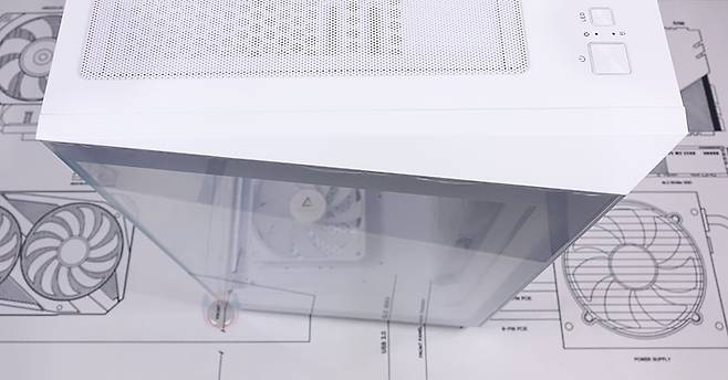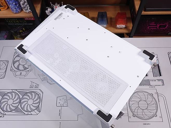 C5 ARGB PC케이스 외형 끝으로, 케이스 밑바닥을 살펴보면, 모서리 부근으로는 약 20mm 높이의 받침대가 적용되어 있으며, 진동소음 최소화를 위해 패드도 기본 부착되어 있습니다. 그리고, 하단 역시 상단과 마찬가지로 자석방식의 먼지 필터가 부착되어 있는데, 분리하면 벌집 모양의 에어홀 처리와 함께 내부에 하단 쿨링시스템으로 팬이 기본 장착된 것을 미리 확인할 수 있죠.