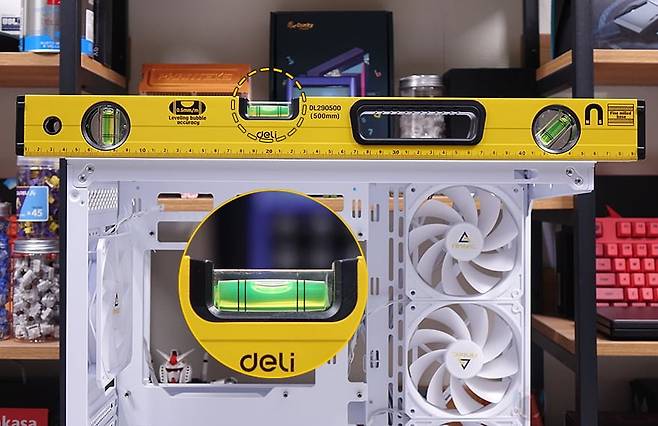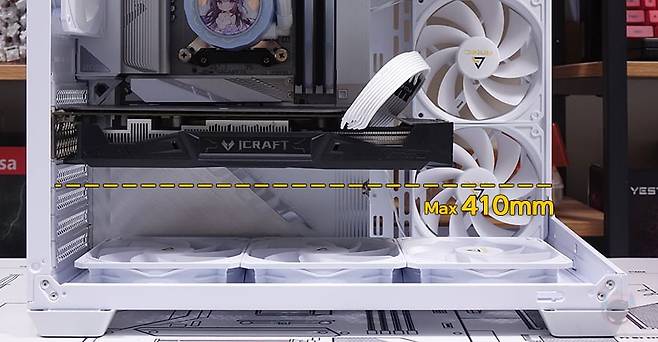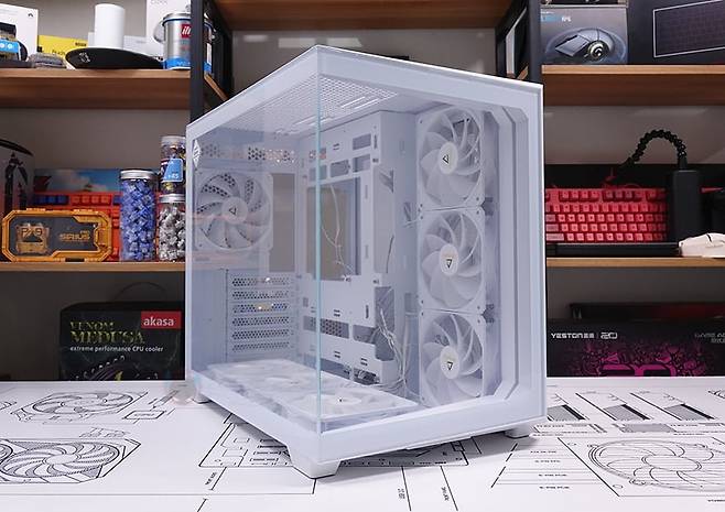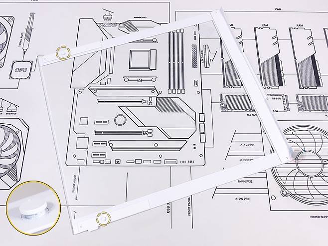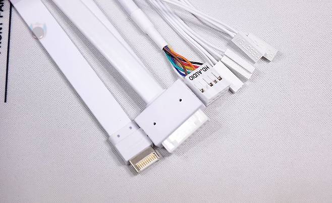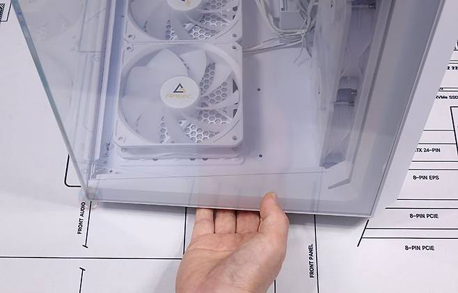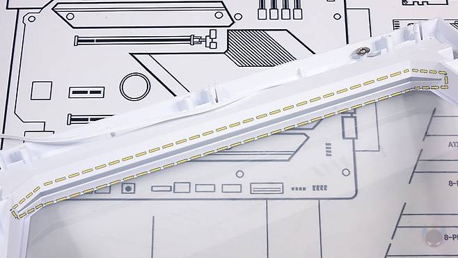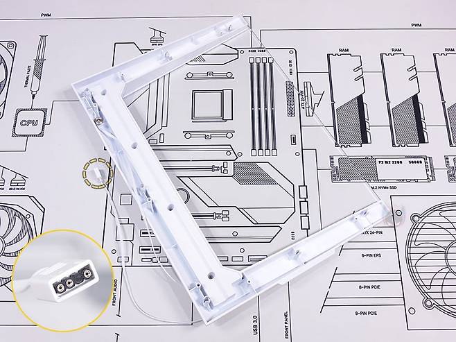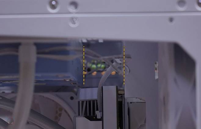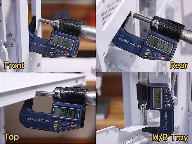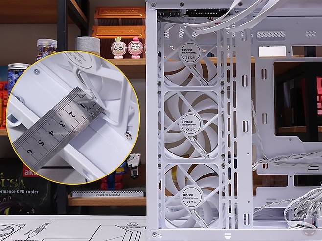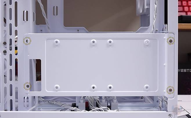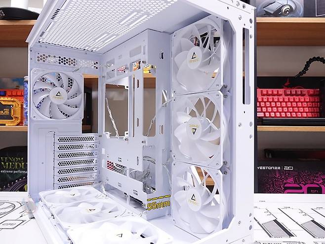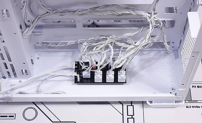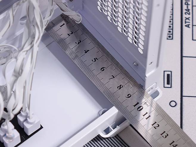 브래킷을 분리한 상태에서 후면 아래 공간을 살펴보면, 팬 허브가 장착되어 기본 제공되는 것을 확인할 수 있는데, 팬 작동의 4pin PWM뿐만 아니라 ARGB을 위한 3pin 헤더도 함께 갖추고 있죠. 각각 총 8개로 최대 8개의 팬을 동시에 컨트롤 연동할 수 있습니다. 그리고, 후면은 파워서플라이와 저장장치가 장착되는 공간이 만큼 후면 공간도 약 95mm(안쪽 88mm)를 확보하고 있죠. 또한, 앞쪽 측면 쿨링시스템 자리 역시 기본 장착된 팬 후면공간이 약 35mm로 경우에 따라서 팬을 후면으로 옮겨서 장착할 수 있고, 수랭쿨러시에는 라디에이터를 듀얼 팬으로 구성할 수 있습니다. 끝으로, 케이블 역시 케이스 색상에 맞추서 화이트 색상으로 적용했으며, C5 ARGB에 사용된 새시(sash)의 두께를 부위별로 측정해 보면 약 0.7~0.9T대라는 걸 확인할 수 있죠.