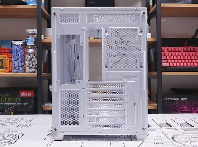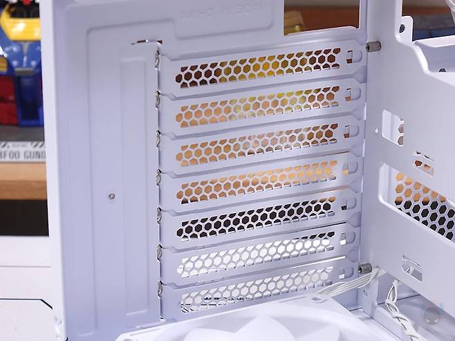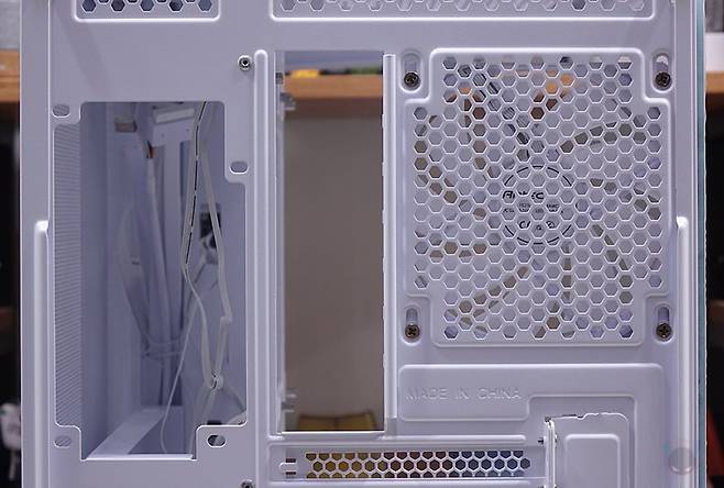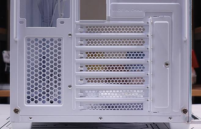 케이스 후면을 살펴보면, C5 ARGB PC케이스가 듀얼 챔버 구조라는 걸 알 수 있습니다. 그러니깐, 파워서플라이가 메인보드와 같은 공간이 아닌 후면 공간에 장착되는 거죠. 이런 구조가 가장 대표적인 컴퓨터 어항케이스입니다. 그래서, 후면을 보면 오른쪽에는 배기역할로 벌집모양의 에어홀 처리와 함께 내부에 120mm 팬이 기본 장착된 것을 간접적으로 먼저 확인할 수 있으며, 같은 위치에서 맨 왼쪽에 파워서플라이 장착되게 나사홀이 적용된 것을 확인할 수 있죠. 그리고, 아래에는 미들타워 기준인 PCI 슬롯이 7개를 갖추고 있으며, 역시 같은 위치에 맨 왼쪽에는 뒤에서 확인하겠지만, 저장장치 및 선정리 공간이 되겠습니다.