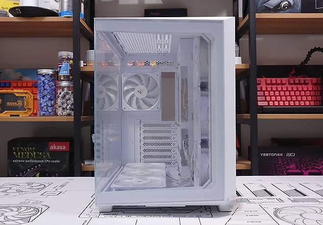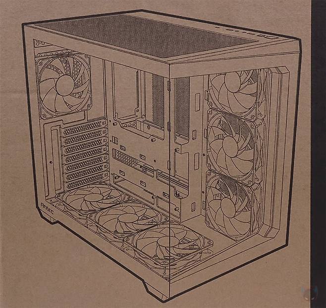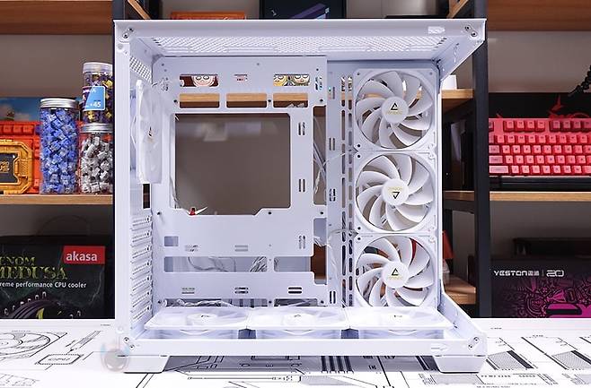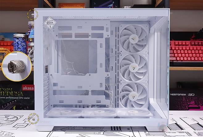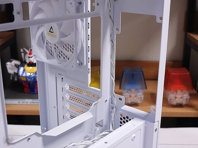 그리고, 내부 하단에도 역시 외부에서 먼저 간접적으로 확인했던 하단 쿨링시스템으로 120mm 팬이 3개 기본 장착된 것을 확인할 수 있는데, 모두 리버스 ARGB 팬입니다. 그러니깐 외부 공기 유입을 측면과 하단에서 하는 기본 쿨링시스템을 갖추고 있는 거죠. 참고로, 리버스 ARGB 팬 모두 작동 연결방식은 4pin PWM이고, ARGB도 3pin 방식입니다. 물론, 후면 배기 역할의 120mm 팬도 동일하죠. 그리고, PCI 슬롯 가이드는 모두 재사용이 가능한 착탈식으로 적용했습니다.