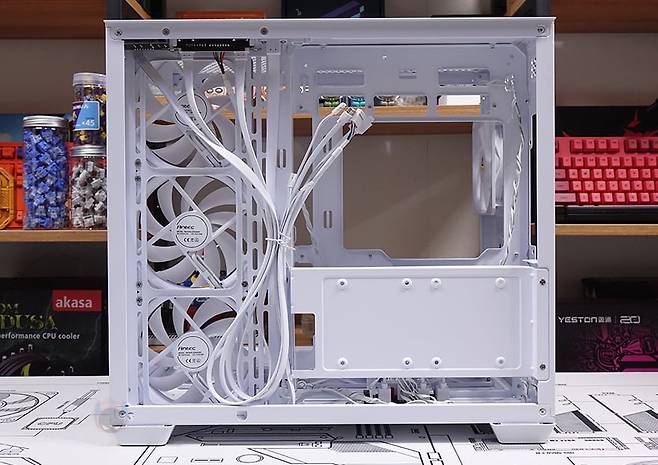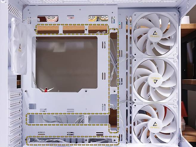 이제, 안텍(Antec) C5 ARGB PC케이스의 내부를 살펴보는데, 컴퓨터 어항케이스 특성상 전면과 측면 강화유리가 만나는 지점에는 수직 골조 프레임이 없습니다. 그래서, 주변 프레임이 튼튼해야 패널을 분리했을 때도 상단 프레임 처짐이 없죠. 실제로 C5 ARGB도 패널을 분리했을 때 상단 프레임이 처지지 않는 것을 확인할 수 있습니다. 그리고, 메인보드가 장착되는 트레이 부분에는 최근 PC시장의 새로운 트렌드로 자리 잡기 위해 나오기 시작한 메인보드 커넥터가 후면으로 배치되는 리버스 커넥터 메인보드(Reverse Connector Motherboard) 일명 BTF 메인보드도 장착할 수 있게 홀처리가 적용되어 있습니다. 물론, CPU-cut-Out도 기본 적용되어 있죠. 또한, 트레이 오른쪽 그러니깐 전면 방향 오른쪽 측면에는 앞서 외부에서 언급했던 컴퓨터 어항케이스 특성상 상 갖춰야 하는 흡기역할의 쿨링시스템이 기본 적용되어 있는데, 바로 120mm 팬 3개가 장착되어 있습니다. 모두 팬 날개가 역방향인 리버스이며 ARGB 팬입니다. 또한, 팬도 전면에서 봤을 때 가려지도록 약 55mm 안쪽으로 배치되었죠. 물론, 이 자리에 기본 팬 대신에 140mm 팬으로 교체할 수 있으며, 최대 2개까지 장착이 가능하고, 수랭쿨러시에는 최대 360mm 라디에이터까지 장착이 가능합니다.