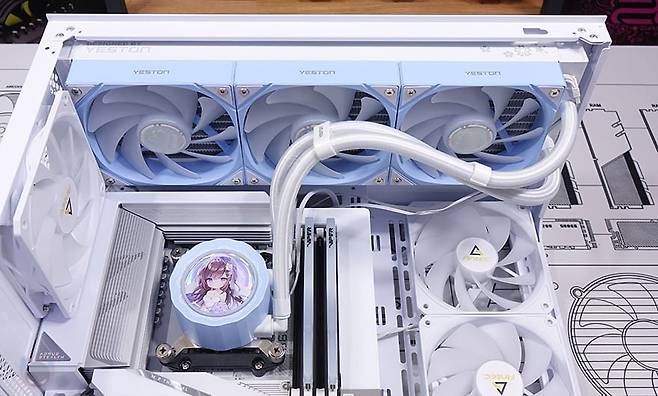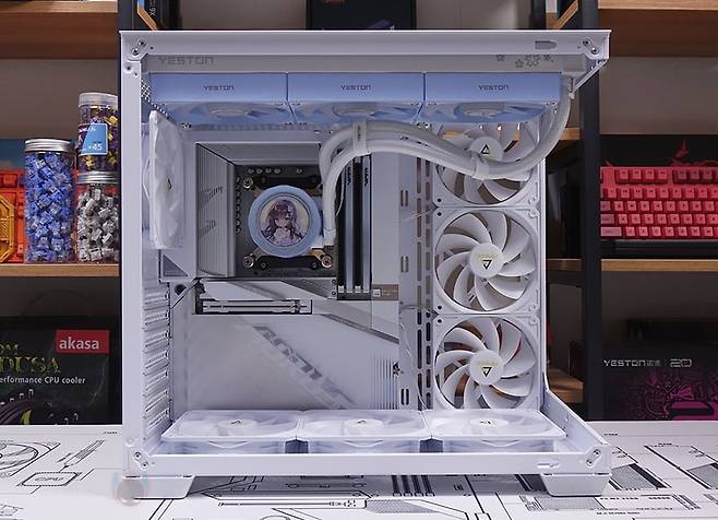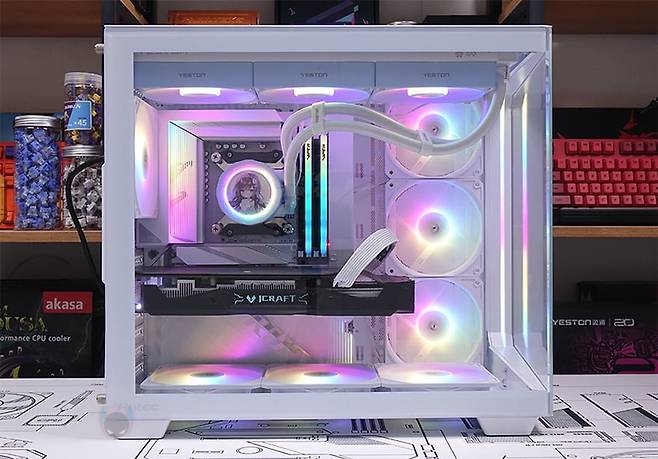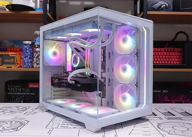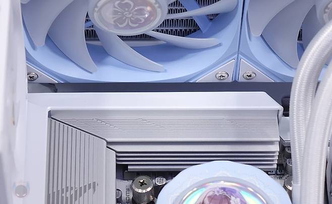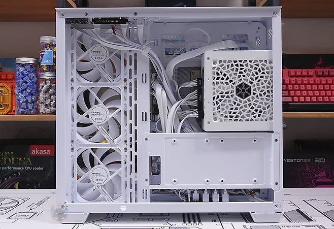 직접, 안텍(Antec) C5 ARGB PC케이스를 사용해 시스템 조립을 해봤습니다. 앞서 내부 확인에서 잠깐 언급했듯이 최근 PC시장에 새로운 트렌드로 자리 잡으려는 메인보드 일명 BTF라 불리는 리버스 커넥터 메인보드 장착을 C5 ARGB는 지원합니다. 그래서, 실제 리버스 커넥터 메인보드를 장착해 보면, 기존 일반 메인보드를 장착했을 때보다 훨씬 깔끔한 내부를 볼 수 있죠. 그리고, CPU 쿨러경우 측면이나 상단에 수랭쿨러 라디에이터를 장착할 수 있는데, 측면에 기본 쿨링시스템을 갖추고 있기 때문에 상단에 360mm 라디에이터를 장착했습니다. 또한, C5 ARGB와 비슷한 크기의 케이스들 상단에 라디에이터가 장착되면 일반적으로 메인보드와 라디에이터 사이의 간격이 협소해지기 때문에, 미리 메인보드 보조전원 케이블을 후면으로 넘겨서 장착해야 하는 불편함이 있는데, 리버스 커넥터 메인보드를 장착하면 이런 부분도 깔끔하게 해결되죠. 물론, 안쪽 간격이 충분히 넓기 때문에 일반 메인보드 장착 시 케이블을 미리 넘기는 건 어렵지 않습니다. 참고로, 타워형 CPU쿨러를 장착경우 최대 160mm 높이까지 지원합니다. 그리고, 그래픽카드 경우 최대 410mm 길이까지 지원하기 때문에 사실상 시장에 판매되는 제품들은 모두 장착이 가능하며, 메인보드에 연결되는 케이블들은 모두 후면에서 이루어지고, 듀얼 챔버 구조라 후면 공간이 넓은 만큼 케이블 정리도 수월하고, 저장장치 브래킷은 일종의 케이블 가림막 역할도 되기 때문에 후면도 깔끔하게 보이도록 마무리할 수 있죠.
