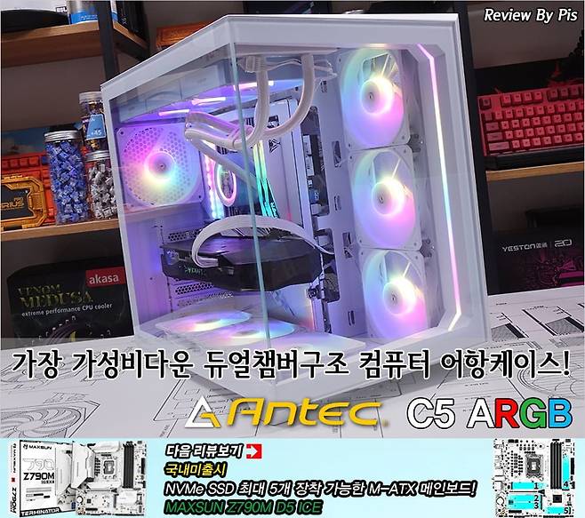 안텍(Antec)의 컴퓨터 어항케이스 라인업인 Constellation(컨스텔레이션) 시리즈에 세 번째 모델로 출시한 C5 ARGB PC케이스는 먼저 나왔던 앞에 두 모델 C8과 C3 ARGB의 특징을 둘 다 볼 수 있는 제품입니다. 파워서플라이가 메인보드 후면에 장착되는 전형적인 컴퓨터 어항케이스 모습을 보여준 C8의 듀얼 챔버 구조를 C5 ARGB 역시 가지고 있죠. 여기에 전면 강화유리 베젤을 입체감 느낌의 기하학 디자인으로 적용했던 C3 ARGB처럼 C5 ARGB도 전면 강화유리베젤을 기하학 디자인으로 적용했습니다. 모델명의 숫자처럼 앞에 두 모델 사이에 배치될 수 있는 제품으로 적절한 특징을 살려낸 제품인 거죠. 또한, C5 ARGB PC케이스는 폭 285mm와 높이, 깊이 모두 500mm가 넘지 않는 크기로 컴퓨터 어항케이스에서 가장 이상적인 사이즈를 가졌습니다. 일반적으로 컴퓨터 어항케이스 폭이 300mm가 넘어가면 심리적으로 부피가 크다라는게 느껴지는데, C5 ARGB는 이런 부피에 대한 부담감이 없다는 거죠. 물론, 시스템 구성에 따라서 내부 공간이 협소하다 느낄 수 있지만, 현재 메인보드 시장에서 새 트렌드로 불고 있는 리버스 커넥터 메인보드 일명 BTF 메인보드 장착을 C5 ARGB에서 지원하기 때문에, 리버스 커넥터 메인보드를 장착하면 이런 공간 협소의 불편함은 모두 해결됩니다. 또한, 컴퓨터 어항케이스 특성상 시각뷰가 더 깔끔하게 보이는 효과도 있죠. 그리고, 무엇보다 이 제품은 기본 팬이 무려 7개를 제공해주고 있어서 소비자입장에서 추가 팬 구성에 대한 비용 부담이 없습니다. 이미 측면과 하단에 외부 공기 흡입 역할의 리버스 팬이 장착되었기 때문에 소비자는 CPU 쿨러로 배기 시스템만 갖추면 되죠. 듀얼 챔버 구조의 부피 부담감 없는 크기부터 기본 팬 제공, 그리고 나름 차별적인 디자인을 가진 가성비 컴퓨터 어항케이스를 원했다면, 안텍(Antec) C5 ARGB를 추천합니다.