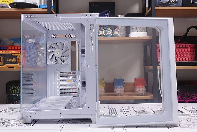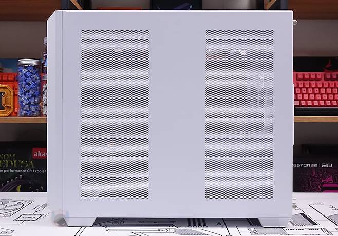 전면 기준으로 왼쪽 사이드 패널 역시 강화유리가 적용되어 있는데, 후면 손나사를 이용한 고정 방식으로, 일반 PC케이스들의 사이드 패널 분리처럼 나사를 풀고, 후방향으로 밀면 강화유리 패널이 분리됩니다. 안쪽에 보면 걸쇠장치가 있는 것도 확인할 수 있죠. 물론, 사이드 패널의 강화유리 역시 45도 방향 베벨링 가공을 적용했습니다. 그래서, C3 ARGB 모델과 마찬가지로 C5 ARGB도 전면과 측면 강화유리가 만나는 지점이 겹치지지 않고 자연스럽죠. 오른쪽 사이드 패널은 가운데를 제외한 양쪽으로 C8과 비슷하게 촘촘한 메쉬 디자인 에어홀을 적용했습니다. 내부 후면에 파워서플라이와 저장장치 그리고 측면 쿨링시스템을 위해 컴퓨터 어항케이스에선 필수라고 할 수 있죠. 물론, 일반 에어홀보다 구멍이 작기 때문에 먼지필터는 적용되어 있지 않습니다.