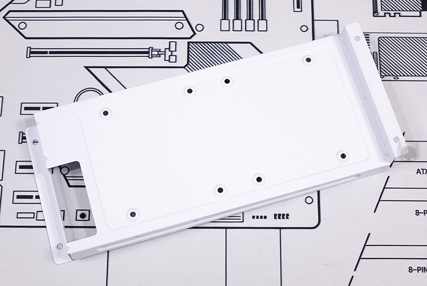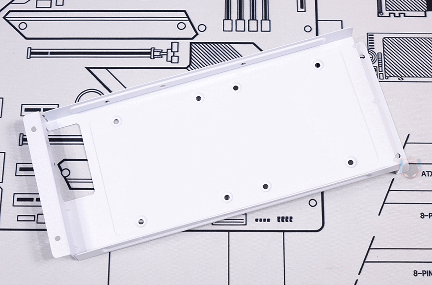 이번엔 내부 후면 그러니깐 메인보드 트레이 후면을 살펴보는데, 앞서 외부에서 잠깐 확인했듯이 트레이 후면 윗부분 정확히는 CPU-cut-Out 부분과 같은 위치에는 파워서플라이가 장착됩니다. 그래서, 받침대 디자인도 적용되어 있죠. 그리고, 그 아래에는 브래킷이 장착되어 있는데, 고정 나사 4개를 풀면 쉽게 분리가 되고, 브라켓은 저장장치를 장착할 수 있는 장치로 바깥쪽에는 2.5인치 HDD/SSD 2개를 장착할 수 있고, 안쪽에는 3.5인치 HDD 1개를 장착할 수 있죠. 안쪽에 HDD가 장착했을 때 케이블 연결을 위해 브라켓 한쪽에 홀처리도 적용되어 있습니다.