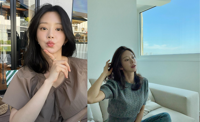 첫 번째 사진에서 이주빈은 그린 톤의 니트 톱과 데님을 매치해 편안하면서도 세련된 룩을 연출하고 있다. 화이트 소파에 앉아 자연스럽게 포즈를 취한 모습에서 일상 속 여유로움이 묻어나며, 큰 창문을 배경으로 한 미니멀한 공간과 조화를 이루고 있다.