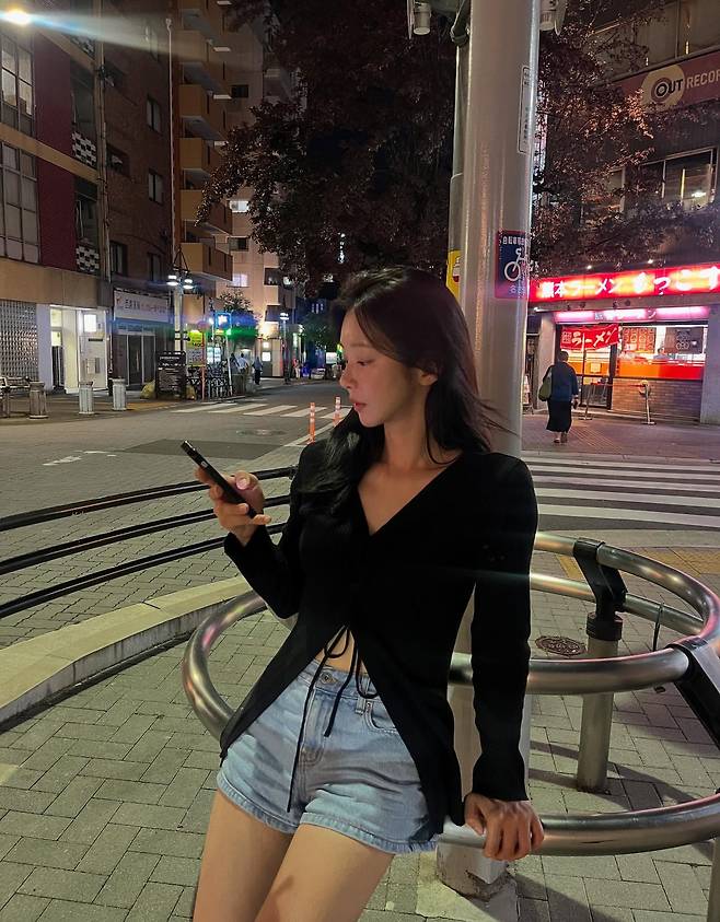 세 번째 야외 사진에서는 블랙 크롭 재킷과 데님 쇼츠의 조합으로 젊고 활동적인 이미지를 연출하고 있다. 밤거리를 배경으로 한 자연스러운 포즈는 도시적인 감각과 캐주얼함을 동시에 표현하며, 실용적이면서도 트렌디한 스타일을 완성하고 있다.
