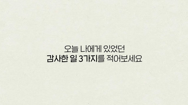 이때 감사일기는 부정적인 생각의 악순환을 끊어내는 절단기 역할을 해요. '어, 오늘 하루도 최악인 줄 알았는데 나에게도 감사한 일이 있었구나' 생각하게 만들어요. 나의 하루를 돌아보면서 나 스스로와 타인이 나에게 했던 감사한 일들을 떠올려 일기를 써보세요. 우리가 색안경을 쓰고 봤던 나의 삶이 사실은 조금 다르다는 것을 알게 될 것입니다.