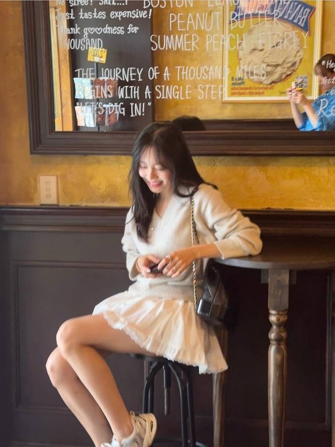 베이지빛 브이넥 니트에 러플 포인트가 더해진 화이트 캉캉 미니스커트를 매치해 발랄한 무드를 연출했습니다.