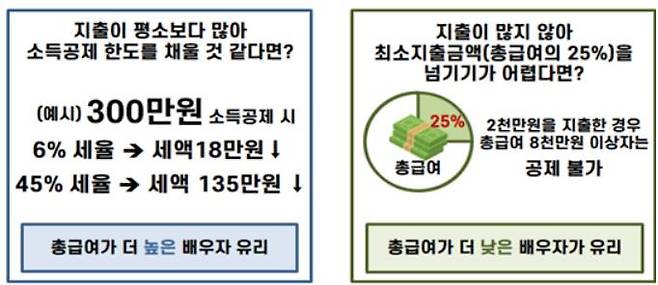 지출이 평소보다 많아 신용카드 등 소득공제 한도를 채울 것으로 예상된다면 총급여가 더 높은 배우자의 명의로 지출해야 혜택이 커진다고 국세청은 설명했다.