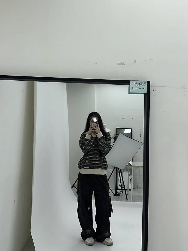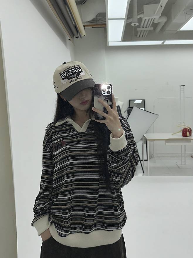 이번 룩은 배색이 포인트인 줄무늬 니트로 시작해요.