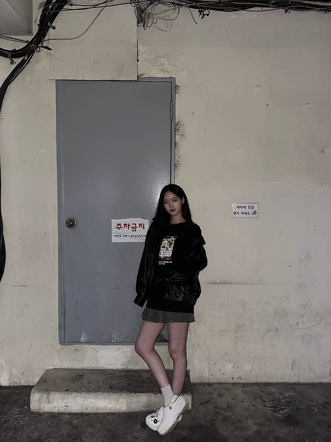 하의는 그레이 컬러의 미니 스커트로 매치해줬어요.