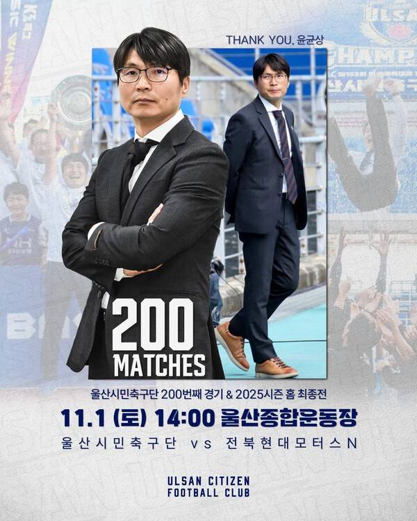 이번 경기는 200경기 모두 지휘봉을 잡고 터치라인에 선 윤균상 감독의 홈 고별전으로 치러진다. 윤균상 감독은 K3·K4리그 통틀어 가장 운영비가 적은 축에 속하는 울산을 이끌고 2019 K3리그 베이직 우승, 2020 K4리그 준우승, 2022년 제103회 전국체육대회 금메달, 2023 K3리그 4위 등 업적을 달성했다.