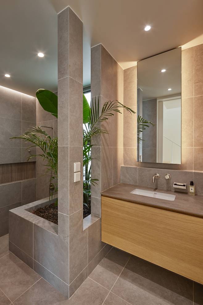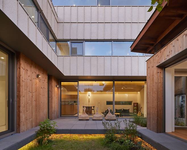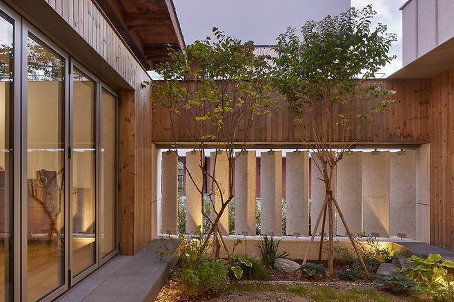 윤슬재의 마당은 움직이는 유연한 경계를 가진다. 변화하는 경계는 석재 루버의 움직임에 의해 만들어진다. 루버의 열리고 닫힘을 통해 마당은 프라이버시가 확보된 온전한 가족의 마당인 동시에 지나치는 동네 사람들의 시선이 머물 수 있는 마을의 작은 정원이 되기도 한다.