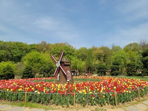형형색색의 튤립 뒤로 자리한 우리나라 전통의 초가집은 동서양의 어색하면서도 아름다운 조화를 이끌어냅니다. 수목원의 정상 부근에서도 튤립 공원을 볼 수 있는데요. 이국적인 풍차가 있어 튤립의 고장인 네덜란드에 온 듯한 착각을 불러일으키곤 합니다.