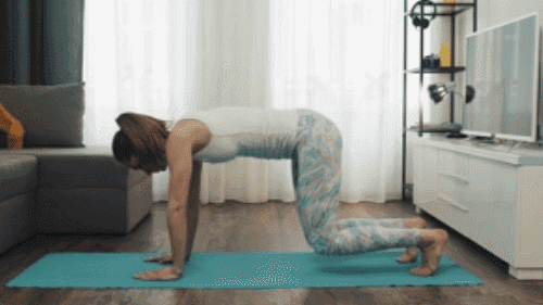 매트에 손과 무릎을 대고 엎드린 상태에서 시작한 뒤, 엉덩이를 들어 올리며 상체를 숙여 다운도그 자세를 만듭니다. 이때 다리는 가능한 한 곧게 펴고 머리는 팔 사이에 위치시켜 목에 긴장이 생기지 않도록 합니다. 이후 엉덩이를 내려 원래 네발기기 자세로 돌아옵니다.
