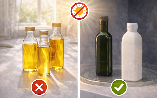 참기름은 빛에 약합니다. 투명 병에 담아 햇빛이 드는 곳에 두면 산패가 빨라집니다.