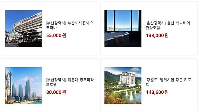 부산 해운대 영무파라드 호텔은 8만원, 제주 성산 골든뷰 호텔은 72000원, 울산 타니베이 호텔은 139,000원으로 기존 투숙비보다 훨씬 저렴한 특가에 만나볼 수 있다.