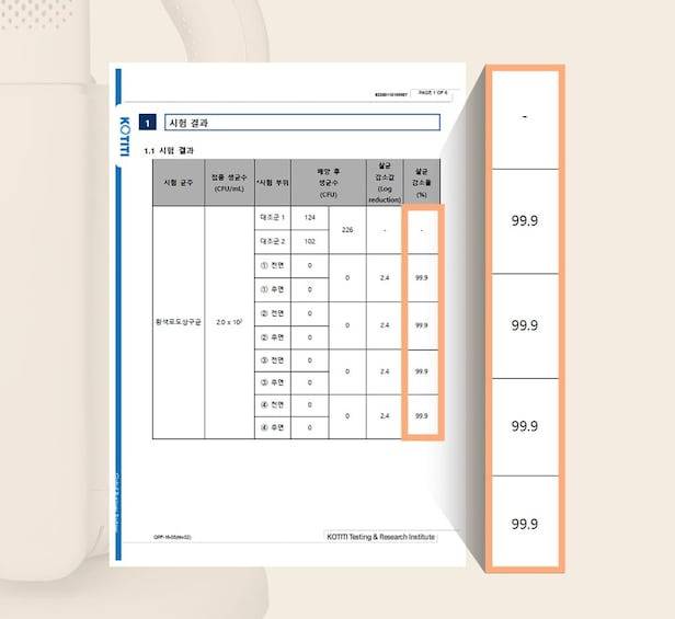 UV-C 자외선 램프가 보이지 않는 세균까지 제거해 줍니다. KOTITI 시험연구원의 테스트 결과, 신발 건조기 사용 후 황색포도상구균이 99.9% 감소한 것으로 나타났습니다. 황색포도상구균은 발냄새의 주요 원인으로 알려져 있죠.