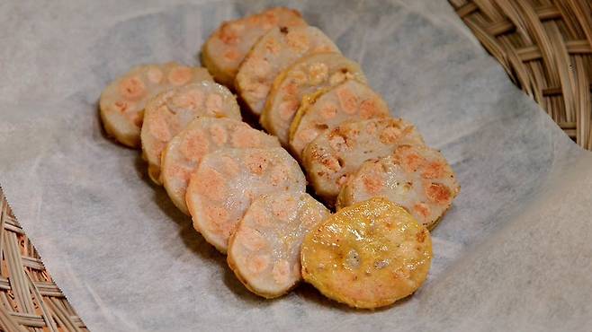 이 과정을 통해 연근명란전의 예쁜 색감과 모양이 더욱 돋보인다. 팬에 기름을 넉넉히 두르고, 약불로 양면을 노릇하게 익히면 바삭하고 고소한 연근명란전이 완성된다.