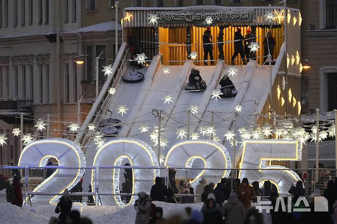 [상트페테르부르크=AP/뉴시스] 15일(현지시각) 크리스마스와 새해를 앞두고 러시아 상트페테르부르크에 열린 크리스마스 마켓에서 사람들이 썰매를 타고 있다. 2024.12.16.