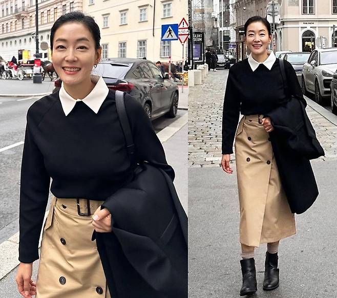 박진희는 블랙 상의에 화이트 칼라 포인트가 더해져 단정하면서도 고급스러운 분위기를 자아내고, 여기에 베이지 컬러의 트렌치 스커트를 매치해 세련미를 한층 더했습니다.