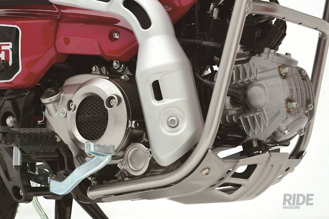 우선 외관에선 ‘이게 커브인가?’ 생각이 들 정도로 닮은 요소가 그리 많지 않다. 커브의 몇몇 흔적들, 레버가 없는 왼쪽 핸들바나 앞뒤 중 원하는 곳을 밟아 변속하는 로터리 방식의 변속기 같은 것에서 커브의 흔적이 일부 남아있긴 하다. 하지만 다른 요소들, 커브의 상징 중 하나였던 레그 실드는 사라지고 그 자리를 언더가드와 이어지는 사이드 가드가 대체하고 있다. 핸들바도 파이프 그대로를 드러낸 꽤 높은 핸들바가 장착됐고, 핸들부에서 시트로 이어지는 프레임은 꽤나 높아 네이키드란 느낌이 더 강하게 들 정도. 하지만 이런 설정들은 전부 오프로드 주행을 위해 최적화된 것으로, 핸들바의 경우 노면이 거친 험지 주행 시 몸으로 전해지는 충격을 줄이기 위해 시트에서 일어선 자세로 주행하는데 이 때 조종을 원활히 하기 위한 목적이다. 사이드 가드는 전도 시 차체의 손상을 최소화하기 위함이고, 높은 프레임은 지상고를 높이기 위해 변경된 부분이라 할 수 있다. 이 외에도 리어 캐리어 아래로 높게 설치된 흡기구, 업 스타일의 머플러, 주행 중 돌이나 장애물이 튀어 엔진이 손상되는 것을 막는 언더가드 등 오프로드에 최적화된 장비들이 두루 갖춰져 있다.