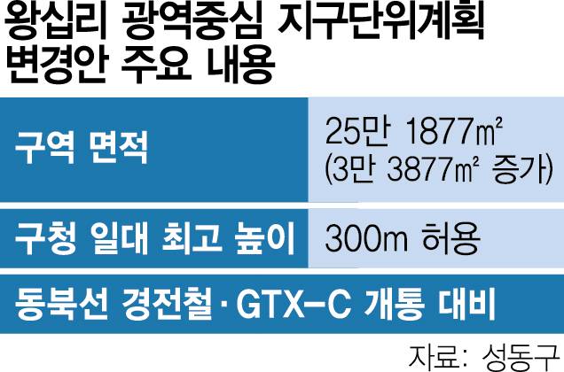 서울 왕십리 역세권 특별계획 구역을 확대하고 성동구청 주변 개발 가능 높이를 최대 300m까지 허용하는 내용의 도시 재정비 계획이 추진된다.