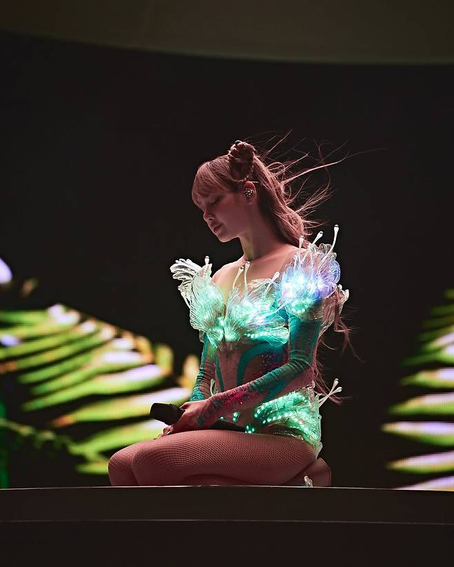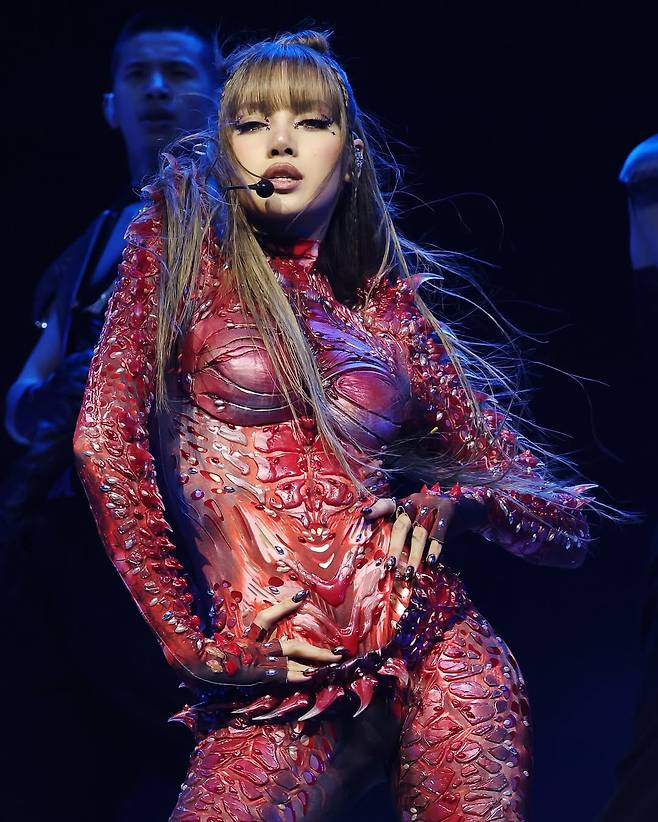 특히 도마뱀을 연상시키는 보디 슈트가 인상적이였죠. 이 의상은 디자이너 ‘애셔 레빈'이 리사를 위해 위해 특별 제작한 커스터마이징 의상으로, AI를 활용해 피부와 비늘 패턴을 설계한 뒤, 모든 디테일을 수작업해 완성했다고 합니다. 함께 매칭한 부츠 역시, 롬바웃의 제품을 수작업으로 커스터마이징해 룩의 완성도를 높였죠.