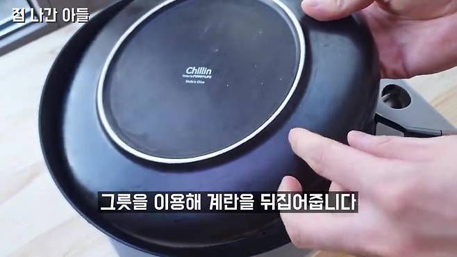 접시를 이용해 계란을 뒤집어줍니다. 조심히 뒤집으면 형태가 예쁘게 유지돼요.
