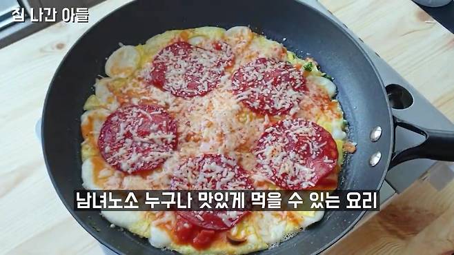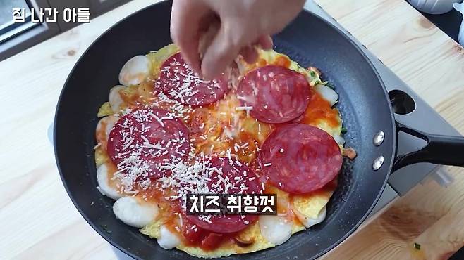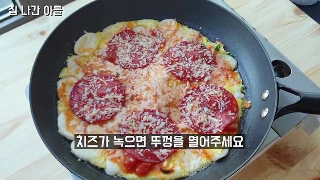 마지막으로 피자치즈를 듬뿍 뿌립니다. 뚜껑을 닫고 치즈가 녹을 때까지 약불에서 익힙니다.