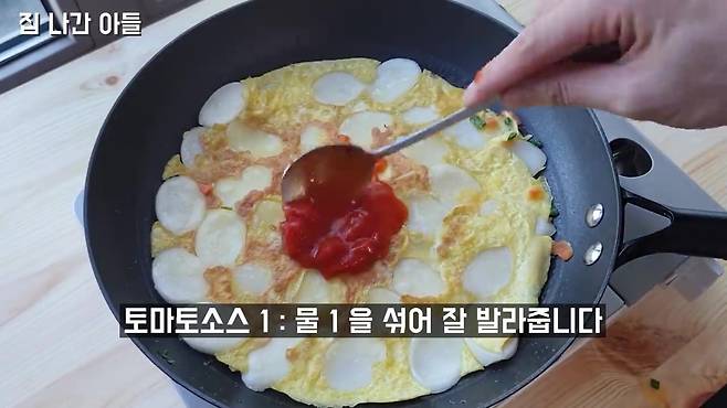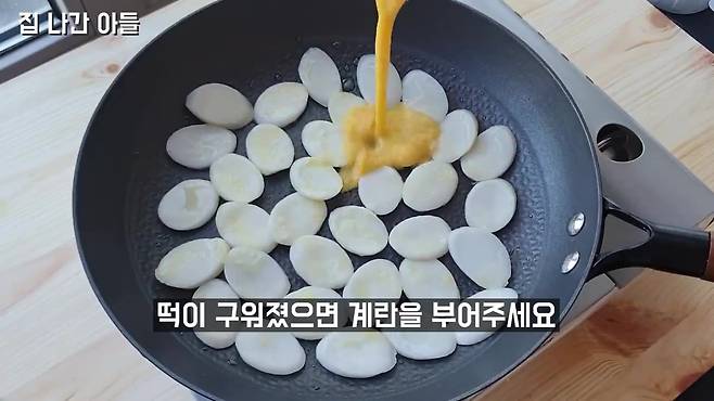 떡이 익으면 계란물을 부어주세요. 떡 사이사이로 잘 스며들게 천천히 부어주는 게 좋아요