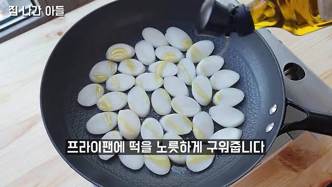프라이팬에 떡을 올리고 올리브유를 두른 뒤 노릇하게 굽습니다. 중불에서 앞뒤로 익혀주세요.