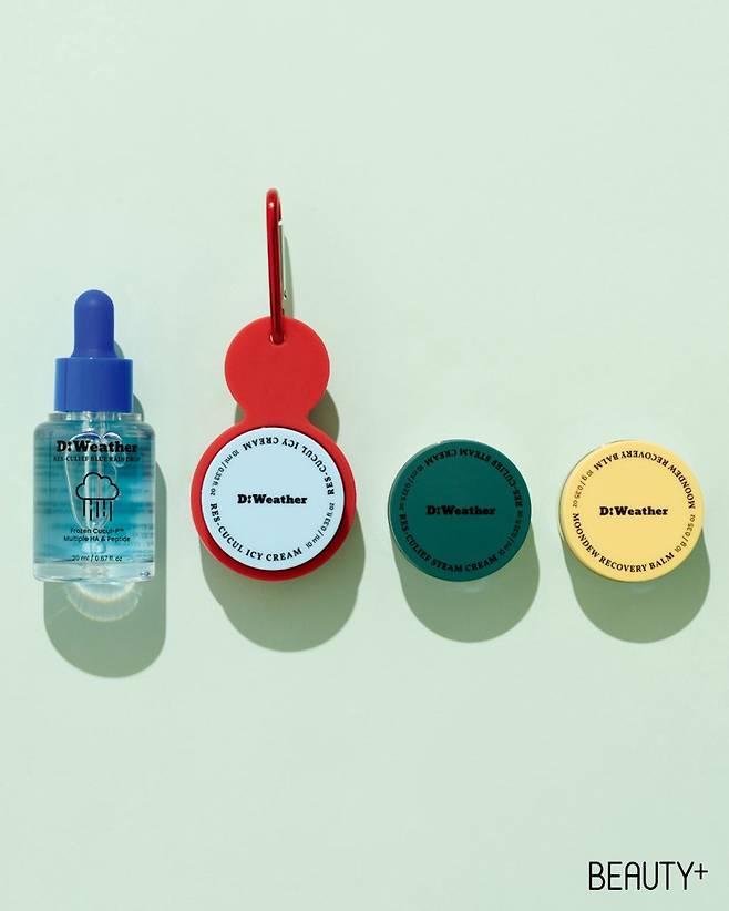 쿨링 진정,광채 보습 크림, 장벽 SOS 멀티밤, 수분광 앰플이 한세트. 가방에 달고 다니며 날씨와 피부 컨디션에 맞춰 골라 바르기 용이하다. 한 세트 3만8천원.