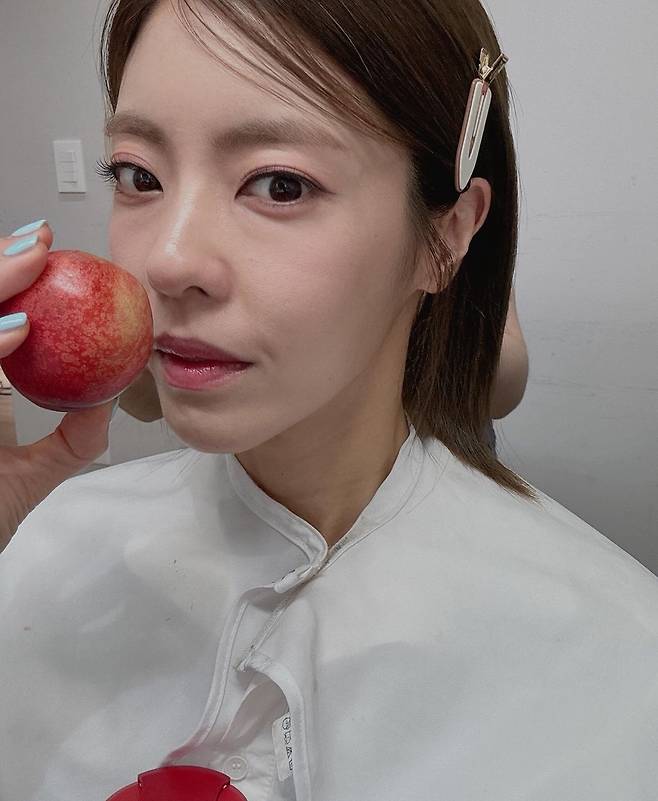 사진 속 이윤지는 손에 든 자두처럼 상큼한 붉은빛의 색조로 메이크업을 완성했습니다.