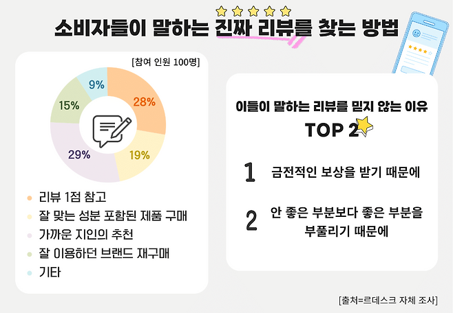 르데스크는 체험단 리뷰에 대한 신뢰 여부를 묻기 위해 시민 100명을 대상으로 설문을 진행했다. 응답자 중 가장 신뢰하는 제품 리뷰가 ‘지인의 실제 후기’라고 밝힌 사람이 29%로 가장 많았으며, 이어 28%는 ‘리뷰 평점 5점보다는 오히려 1점 리뷰를 참고한다’고 응답했다. 그 외에는 자신에게 맞는 성분 위주의 제품 구매(22%)와 기존에 잘 사용하던 브랜드 재구매(21%)가 뒤를 이었다.
