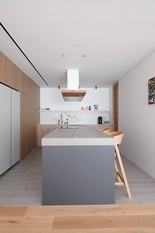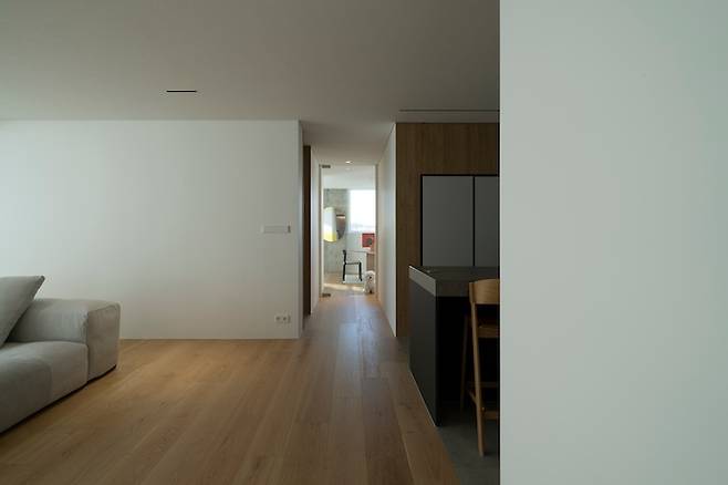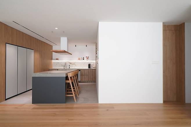 거실에서 바라보는 주방, 우측 흰 벽면에는 그림을 걸 예정이라 벽면보강 및 액자레일을 미리 시공했습니다. 아직까지도 맘에 드는 그림을 찾지 못해서 흰벽 그대로 여백의 미를 보여주고 있습니다.