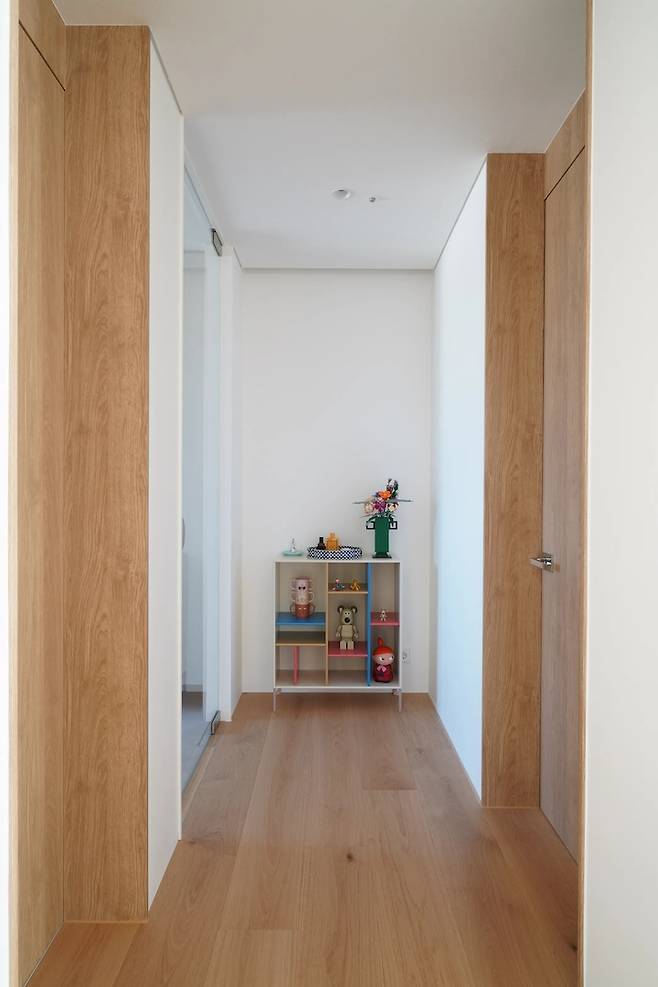 파우더룸 공간 맞은편엔 흰 벽이 밋밋해 수납이 가능한 오픈장으로 만들었고, 장식품들을 진열하고 있습니다.